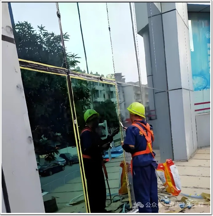 清潔膠縫并注膠:金屬板與板之間的間隙一般為10-20mm,用密封膠或橡膠條等彈性材料封堵。在垂直接縫內放置襯墊棒。幕墻板塊接縫及周邊封口防水注膠。注膠工藝按 QB/LYGJ·202《密封膠現場注及工藝》進行。注膠前應在鋁合金板上貼保護膠紙帶,防止鋁合金板表面被膠污染。注耐候膠應密實、平滑、注膠寬度保持一致。清潔中所使用的清潔劑應對金屬板、膠及鋁合金(鋼型材(詞條“鋼型材”由行業大百科提供)等材料無任何腐蝕作用)