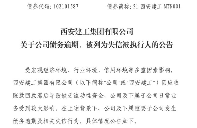 近日,西安建工集團有限公司發布《關于公司債務逾期、被列為失信被執行人的公告》,根據該公告顯示: