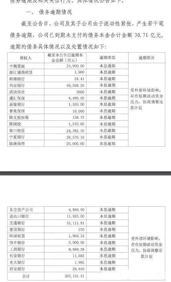 公司及其子公司由于流動性緊張,產生若干筆債務逾期,公司已到期未支付的債務本金合計金額30.71億元,逾期的債務具體情況以及處置情況如下: