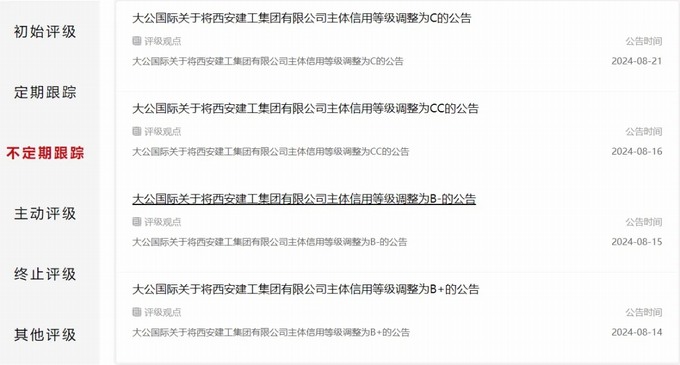 盡管西安市國資委曾給予支持,但成效甚微。跟蹤期內,大公國際對其主體信用等級多次下調,僅去年8月就有6次,從BBB-降至CC,反映出其信用狀況急劇惡化。