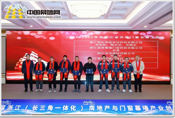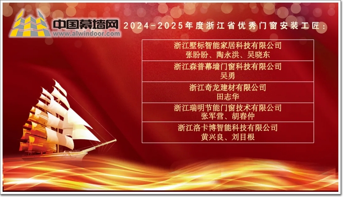 獲得“2024-2025年度浙江省優秀門窗安裝工匠”的是:浙江墅標智能家居科技有限公司張盼盼、陶永洪、吳曉東;浙江森普幕墻門窗科技有限公司吳勇;