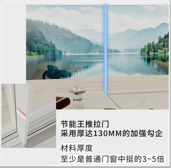 采用130mm厚度的加強勾企,材料厚度是普通門窗(詞條“窗”由行業大百科提供)中挺的3~5倍。同時采用扇框隱形設計,門扇閉合時邊框可包裹開扇,視覺極簡,也讓門扇“進站停靠”,扇框與邊框組合成一體式的防風立柱,狂風暴風也無法撼動。