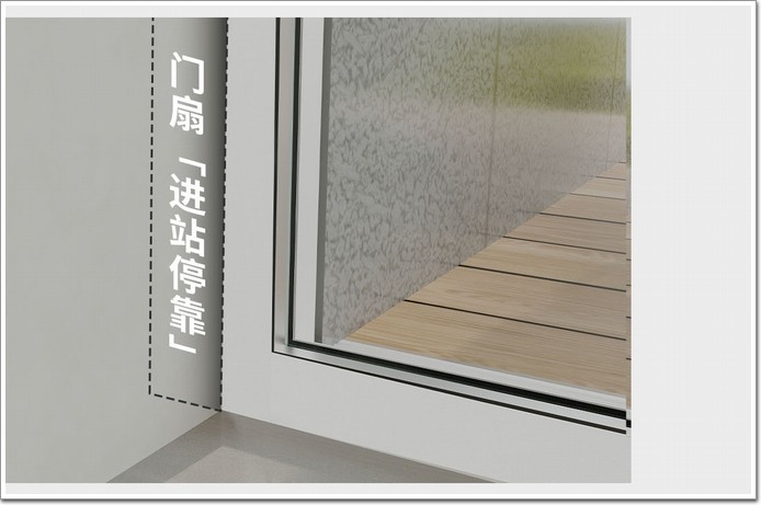 頂部上軌,在門扇頂端四角設計有四軸防擺輪,保障門扇始終和左右邊框有一定距離且距離均等,推拉航線順暢無阻,不磕碰、不搖擺。