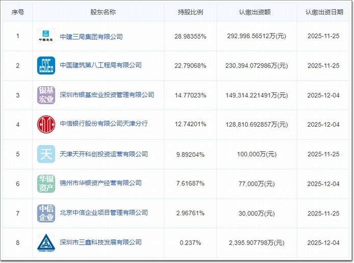 接盤者——天津天信華創集團,是一家成立于2025年11月20日的“?顚S闷髽I”,其中:中建三局持股28.98%,中建八局持股22.79%,兩家中建系巨頭合計持股超過51%。