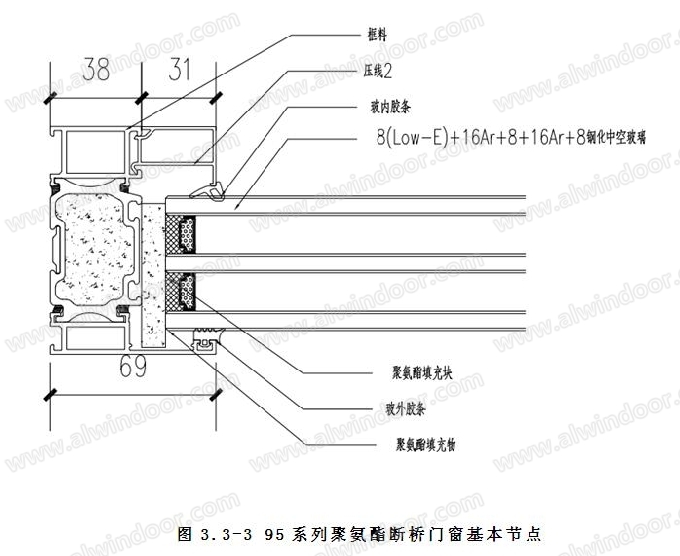 如下圖分別為超低能耗窗墻和聚氨酯門窗的基本構造做法。本窗墻系統隔熱條長度達49mm,隔熱條和玻璃之間腔體(詞條“腔體”由行業大百科提供)通過填充聚氨酯隔熱塊來降低熱量的傳遞和對流(詞條“對流”由行業大百科提供)。本項目的北側洞口門窗采用95系列聚氨酯斷橋門窗,其配置如下圖,其聚氨酯尼龍共擠門窗的斷橋部分長度達60mm,腔體全部用聚氨酯材質填充。