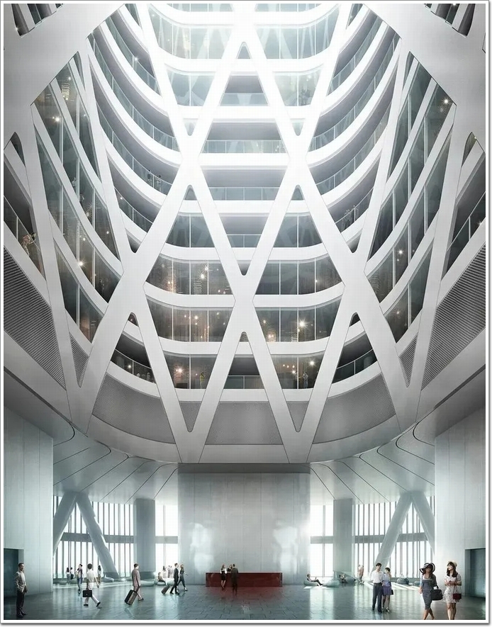 建筑的正面,菱形斜撐巧妙地抵擋著風(fēng)和扭轉(zhuǎn)力的挑戰(zhàn)!而這座建筑的內(nèi)部,40%的住宅區(qū)域;35%的辦公區(qū)域;8%的商業(yè)區(qū);而17%的酒店部分。