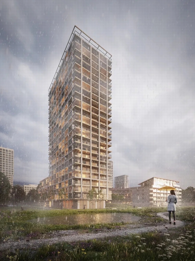 坂茂在安特衛普新南區的最新項目是一座 25 層的混合型住宅塔樓,擁有 295 個單元,結合了木材、混凝土和鋼材,以實現生態高效。該設計融入了坂茂標志性的木質外墻,以及由景觀建筑師 Bas Smets 設計的 6000 平方米的日式庭院,營造了一個綠色的環境。該項目計劃于 2025 年 12 月完工。