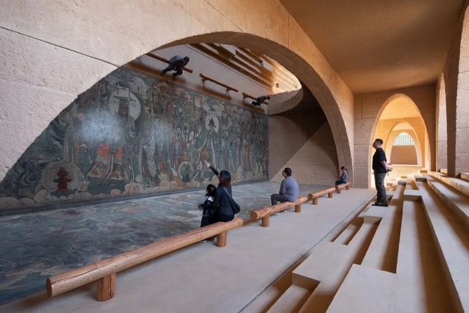 永樂宮因三門峽水電站建設而整體搬遷后,這個現存元代最大宮殿群的痕跡已被 60 余年的農業生產徹底抹凈。隨著山西省黃河一號旅游公路的建成,呂祖故里景區建設也隨之開始,通過將現有場地上的建筑加以整理,西翼的呂公祠園區和東翼的壁畫體驗廳共同界定了留白的中央主軸,讓人體驗永樂宮選址和天地山河的奧妙關系。