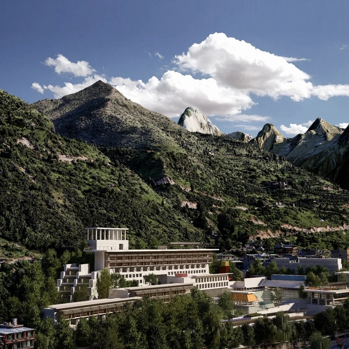 麗世鹽絢度假酒店位于四川省阿壩州小金縣四姑娘山鎮長坪溝河谷臺地,場地海拔 3250 米,內部高差達 20 米,邊界被大量植物包圍。建筑群規劃布局以“山城聚落”的概念,順山勢、地勢、水勢而為,同時完整保留下了場地現有的植被和它們已形成的空間格局。