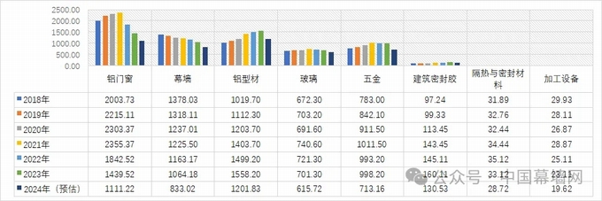 2018年-2024年鋁門窗幕墻產值分類匯總表