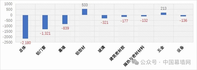 從整體產值分類統計來看鋁型材,五金配件、建筑玻璃,以及密封膠、加工設備(詞條“設備”由行業大百科提供)等都出現了產值下降的現象,工程類門窗企業的日子非常難過,較多項目還受到了“債務”的影響,從項目開工率和付款周期等兩個方面,導致了鋁門窗行業國內訂單減半。