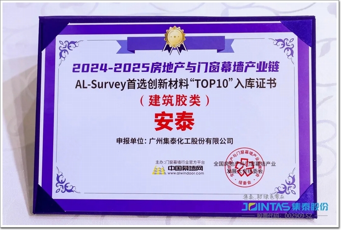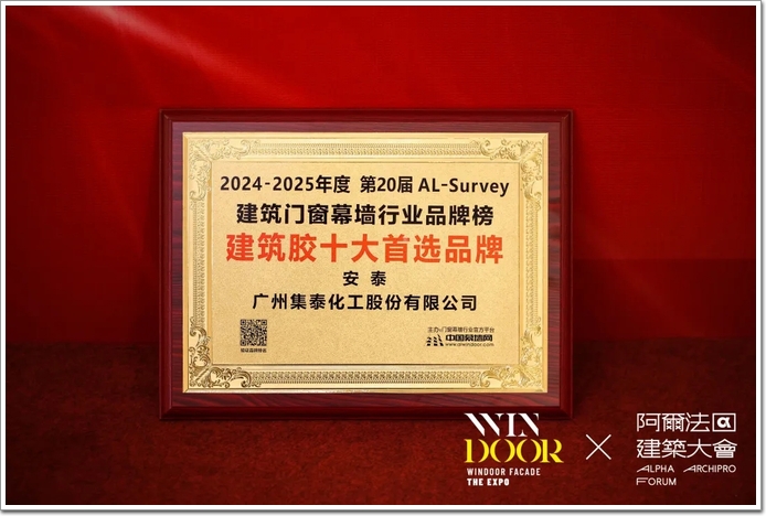 3月10日,展會開幕前夕,第31屆全國鋁門窗幕墻行業(yè)年會舉行。在會上頒發(fā)的“2024-2025年度第20屆AL-Survey門窗幕墻行業(yè)大型讀者調(diào)查活動”評選獎項中,集泰股份第20次獲得“建筑膠十大首選品牌”肯定,并入庫首選創(chuàng)新材料(建筑膠類)“TOP10”。