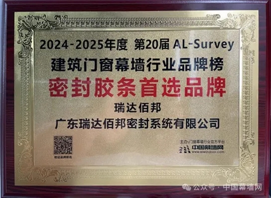 同時(shí),瑞達(dá)佰邦憑借科學(xué)經(jīng)營(yíng)、有效規(guī)劃、優(yōu)質(zhì)產(chǎn)品、完善服務(wù)贏得市場(chǎng)與客戶(hù)的喜愛(ài)與青睞,并贏得了行業(yè)專(zhuān)家、房地產(chǎn)企業(yè)、設(shè)計(jì)院、顧問(wèn)公司的一致認(rèn)可,在第20屆AL-Survey2024-2025中國(guó)門(mén)窗幕墻行業(yè)大型數(shù)據(jù)調(diào)查選活動(dòng)中,蟬聯(lián)“密封膠條首選品牌”大獎(jiǎng)!