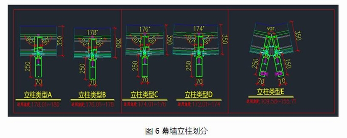 通過數(shù)值取整后,仍有29組變化角度,開模仍然需要多套單元體轉(zhuǎn)角模具,模具費用大,不利用成本的節(jié)約,針對以上角度變化規(guī)律分析,亟待提出一種類似平板合頁式的單元體轉(zhuǎn)角轉(zhuǎn)換料,在單元體的室內(nèi)側(cè)增加任意角度開合的合頁軸,內(nèi)穿不銹鋼軸,適應(yīng)多變角度,單元體兩道防水(詞條“防水”由行業(yè)大百科提供)密封線位置,采用型材飛邊與兩段共圓心的弧段連接,左右側(cè)采用單元體母料與轉(zhuǎn)角轉(zhuǎn)換公料連接,形成類似門窗(詞條“門窗”由行業(yè)大百科提供)轉(zhuǎn)換中梃的結(jié)構(gòu),詳見幕墻系統(tǒng)E。通過以上五組系統(tǒng)的組合,建筑平面內(nèi)實現(xiàn)單元體的閉合。