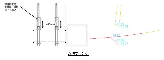 最下邊一根拉桿不受力,為裝飾拉桿,拉桿底部設置可自由伸縮的套筒,最大可實現正負40mm的變形。實際拉桿變形最大21.96mm,目前構造能夠滿足最大變形