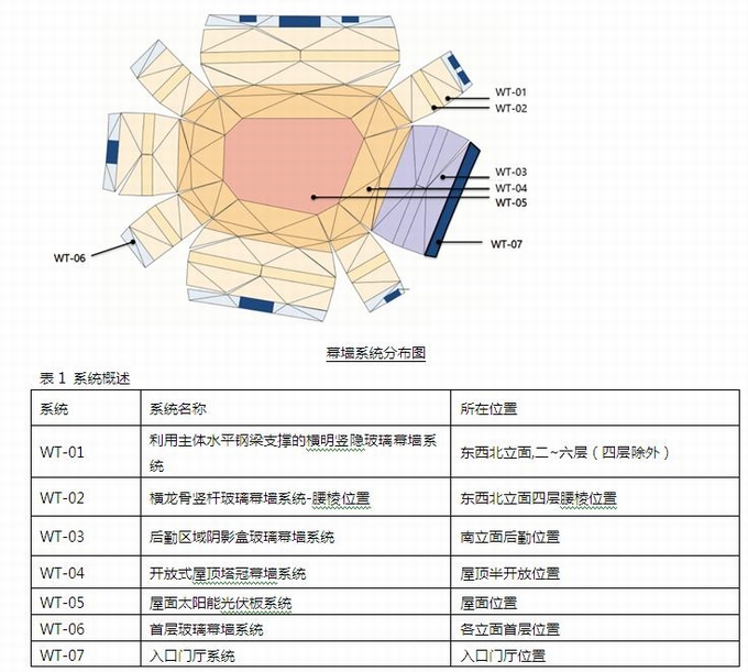 根據規范要求,表皮傾斜角度以建筑表皮與水平方向的夾角75°為界,小于75°的為采光頂,大于等于75°且小于90°的為斜幕墻。等于90°的為直幕墻。本項目只有位于腰棱位置的WT-02系統為直幕墻,其余均為斜幕墻和采光頂。