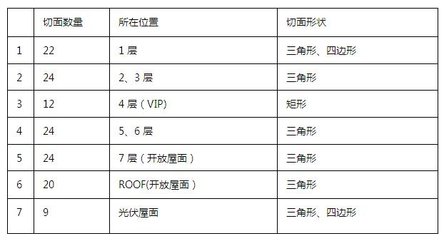 為了表達建筑整體鉆石造型的設計理念,建筑形體由三角形切面和四邊形切面組成,經過分析,建筑共有135個切面,切面布置方式如下: