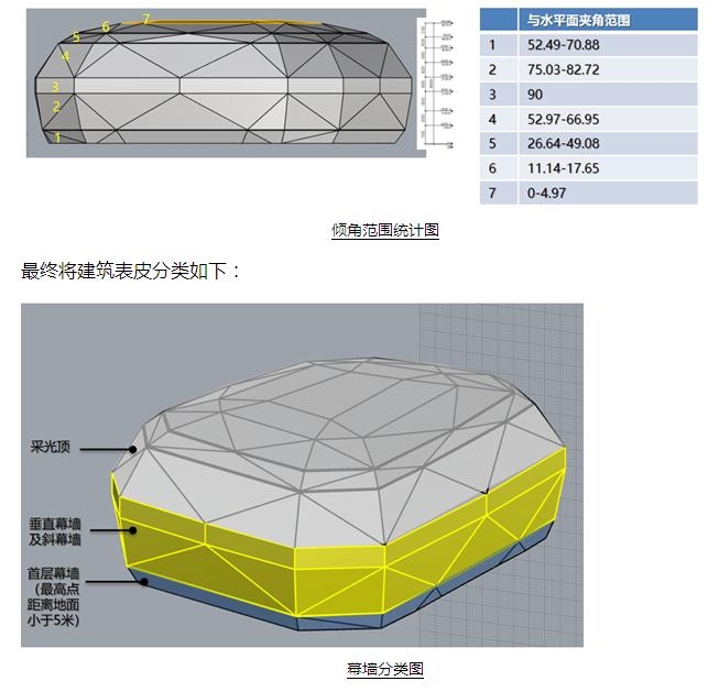 基于建筑形體的復雜造型,為了更好的確定幕墻系統及分格的劃分,本項目以BIM為工具,對建筑形體進行參數化分析,主要進行了以下參數的分析: