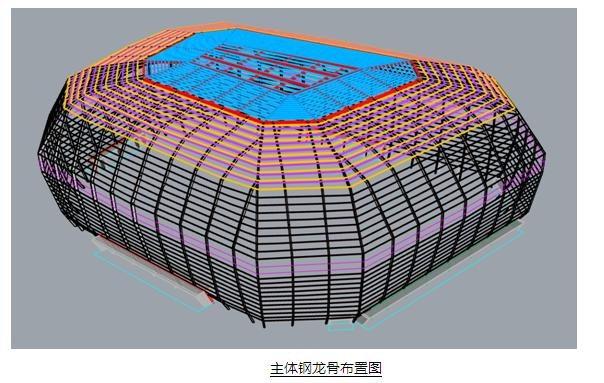 因為本項目的特殊造型及大跨度的受力模式,很難采用普通的幕墻龍骨系統實現。最終選擇了由主體結構完成整體鋼架,除首層、VIP部位外,其余位置幕墻分格背后均有主體鋼龍骨,主體鋼龍骨模型如下。