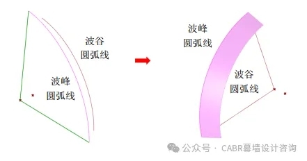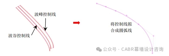 圓弧線生成:分別抽取原模型曲面波峰波谷控制輪廓線,進行弧線擬合,將控制曲線均有理化為圓弧線。