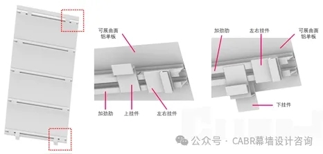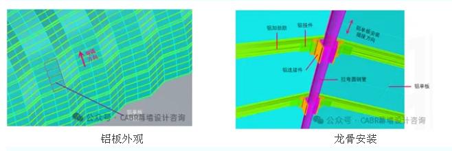 可展曲面鋁單板可以選擇現場成型的方式,就是將裁剪成形后的鋁單板平板,在工廠內安裝加勁肋等構件后,直接包裝運輸到工地,在現場最終安裝成型。這種方式的鋁板成型過渡平滑,現場可進行精度調節,成型效果好,但構造節點復雜,設計難度較大。