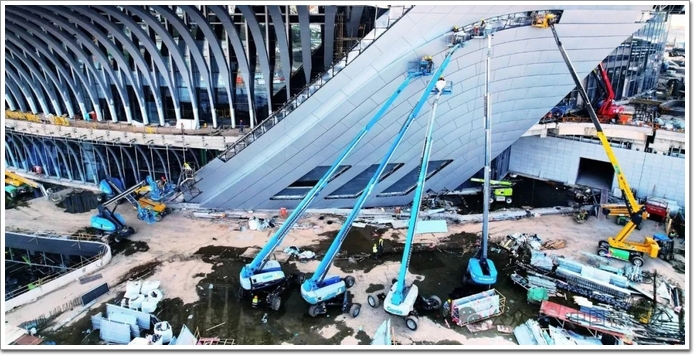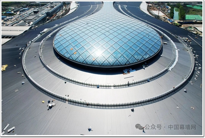 通過幕墻落地過程的全面復盤,中國幕墻網ALwindoor.com發現:項目中難度最大的部分是結構體系復雜+異形超大跨度管桁架(詞條“桁架”由行業大百科提供)鋼屋蓋+流水環繞飛碟雙曲造型屋面幕墻……多個不同幕墻單元系統組合,這對設計、施工、材料等方方面面都提出了極高的要求。
