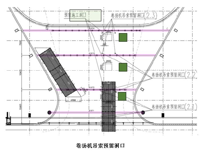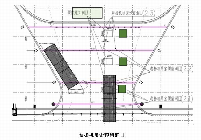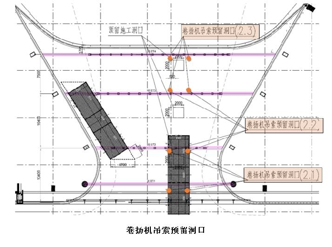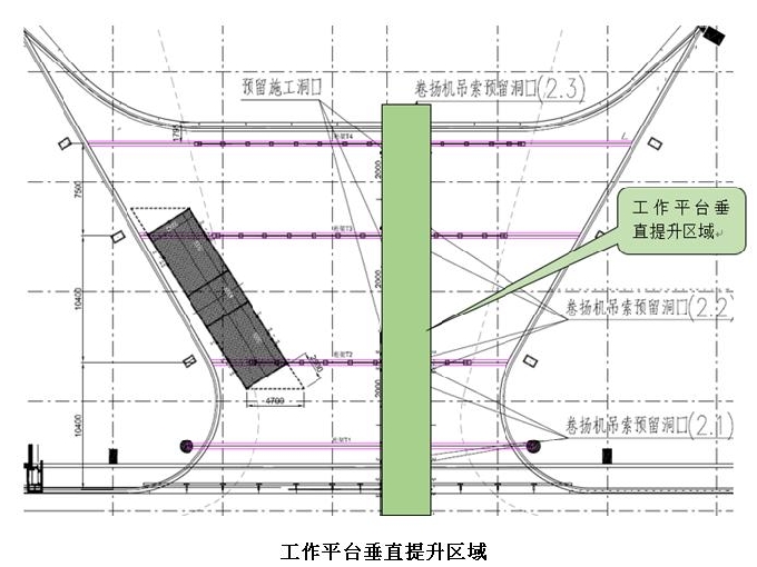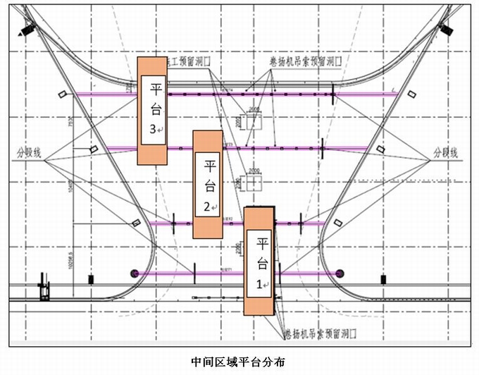 整個(gè)系統(tǒng)設(shè)置4條平臺(tái)軌道,3臺(tái)移動(dòng)工作平臺(tái),8個(gè)卷?yè)P(yáng)機(jī)吊繩點(diǎn),每臺(tái)工作平臺(tái)設(shè)4個(gè)提升點(diǎn)。平臺(tái)提升位設(shè)置于中間位置(見下圖)。