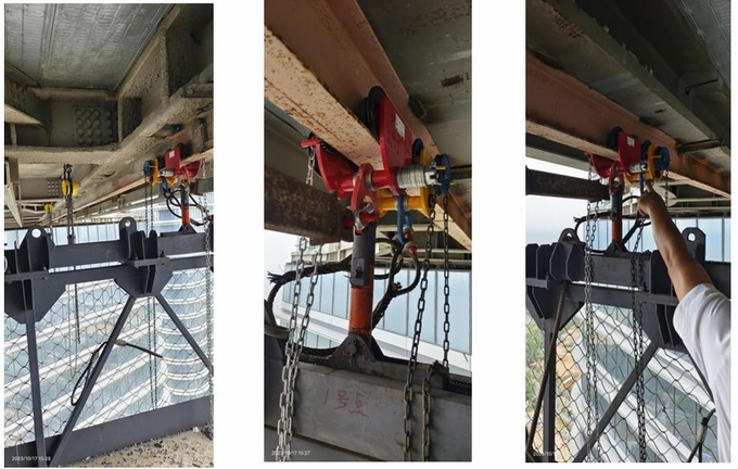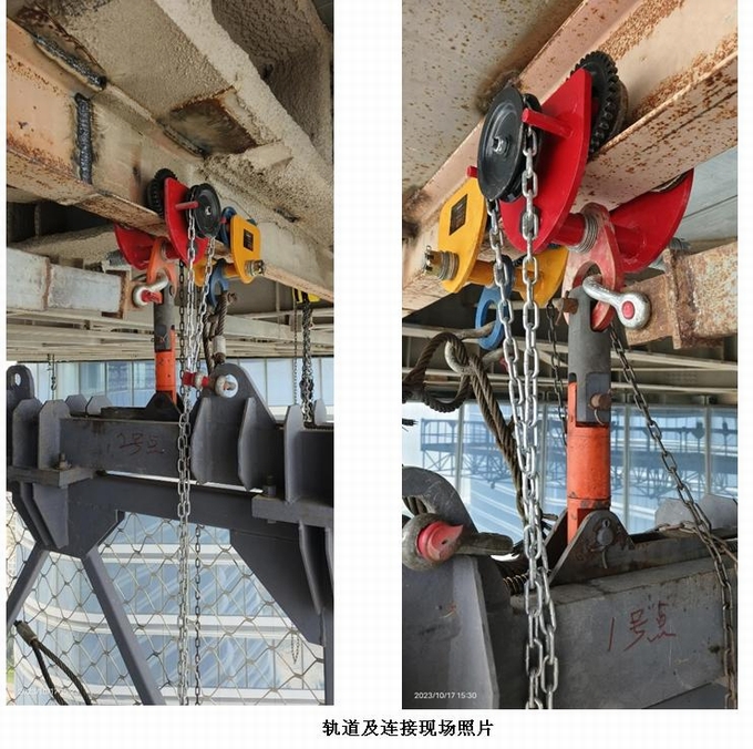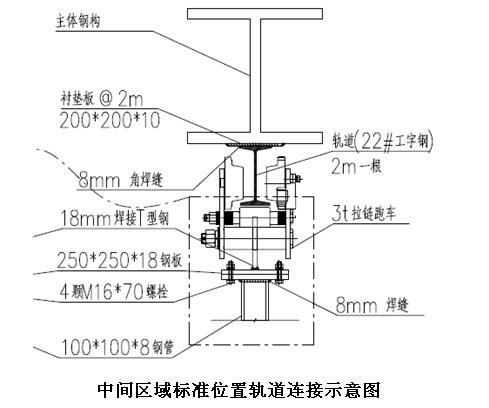 平臺(tái)與軌道的鏈接通過3T的拉鏈軌道跑車進(jìn)行鏈接,每個(gè)鏈接點(diǎn)采用2個(gè)軌道跑車進(jìn)行鏈接,其中一個(gè)跑車通過3T手拉葫蘆與平臺(tái)進(jìn)行鏈接,平臺(tái)調(diào)整平整到位后,再用第二個(gè)軌道跑車通過100*100*8的方管與平臺(tái)可靠鏈接,防止平臺(tái)晃動(dòng)。