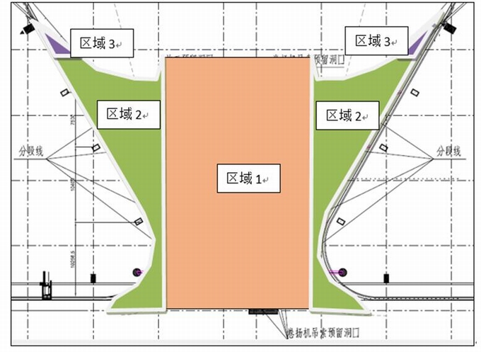 本系統(tǒng)分為三個(gè)工作面:(1)中間大面區(qū)域(區(qū)域1),可以通過平臺(tái)標(biāo)準(zhǔn)布置來完成施工;(2)邊部區(qū)域(區(qū)域2),可以通過平臺(tái)的斜向布置來完成作業(yè);(3)角部部區(qū)域(區(qū)域3)通過吊頂擦窗機(jī)配合施工來完成。安裝次序?yàn)橄戎虚g后兩邊。見下圖。
