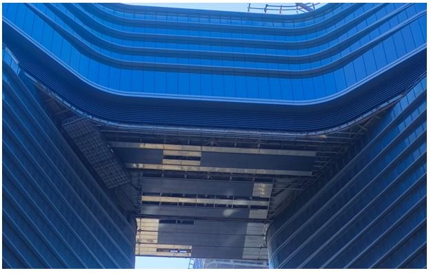 根據(jù)總包計(jì)劃,連廊鋼結(jié)構(gòu)是進(jìn)行整體吊裝,但由于受到主體結(jié)構(gòu)限制,起吊部位為中部區(qū)域,鋼結(jié)構(gòu)在地面制作預(yù)提升至1.7米時(shí),我司在地面完成此區(qū)域擦窗(詞條“窗”由行業(yè)大百科提供)機(jī)軌道以及鋁板龍骨安裝。