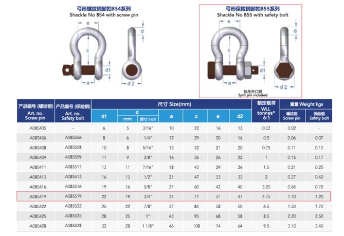 卸扣:A085419 額定載荷4.75t,平臺(tái)上8個(gè),滑車上8個(gè)。
