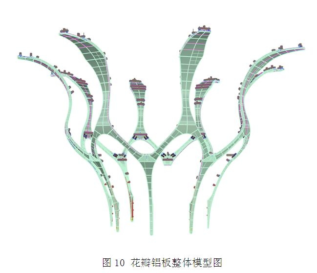 通過和幕墻設(shè)計(jì)單位溝通,我們先將整個(gè)鋁板花瓣整體重新建模,對鋁板面進(jìn)行曲面優(yōu)化,而且,建模過程調(diào)整了造型和主體結(jié)構(gòu)之間的距離,避免出現(xiàn)過大的懸挑支撐。整個(gè)造型采用大截面的圓鋼管找型,方便加工,優(yōu)化后整體模型見圖10。