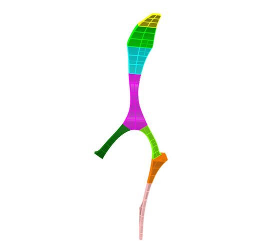 整個(gè)鋁板造型的尺寸較大,如果采用先吊焊接鋼結(jié)構(gòu)后安裝鋁板的方式,則施工難度較大。于是,深化設(shè)計(jì)將整個(gè)鋁板花瓣分解成64個(gè)獨(dú)立的單元,8種獨(dú)立單元,每種單元用不同顏色表達(dá),見圖14。