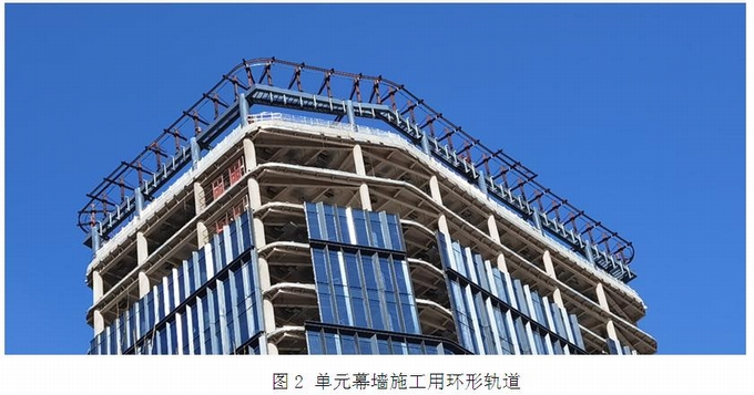 單元式幕墻是在工廠組裝好,到現(xiàn)場直接安裝的一種幕墻形式。單元式幕墻裝配化程度高,裝配質(zhì)量好。其安裝方式通常采用自制吊裝設(shè)備進(jìn)行,比如采用移動小吊車,或者環(huán)形軌道進(jìn)行安裝。見圖2示意,有些單元式幕墻的外側(cè)設(shè)置了比較大的裝飾條或者其它構(gòu)件,無法和單元幕墻板塊一起同時(shí)吊裝,需要二次安裝。這時(shí)候,需要在屋面或者環(huán)軌上架設(shè)吊籃將施工人員放在幕墻外側(cè)進(jìn)行施工。