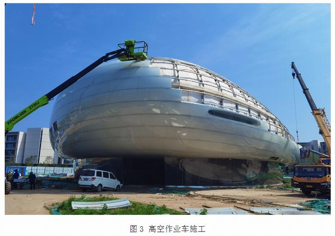 通過高空作業(yè)車將施工人員舉升至相應(yīng)位置,施工人員從外部安裝,高空作業(yè)車目前應(yīng)用十分廣泛,可以針對很多類型的幕墻進(jìn)行施工,見圖3示意。