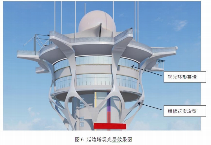 延邊塔是一個(gè)超高層觀光塔,是一個(gè)既有建筑幕墻改造工程。建筑位于延邊帽兒山風(fēng)景區(qū),現(xiàn)場不利于大型機(jī)械進(jìn)出。延邊塔的觀光層有兩層,位于建筑標(biāo)高163m的位置,雙曲面花瓣鋁板造型從觀光層上一直延伸到觀光層下部。觀光層改造后效果見圖6。