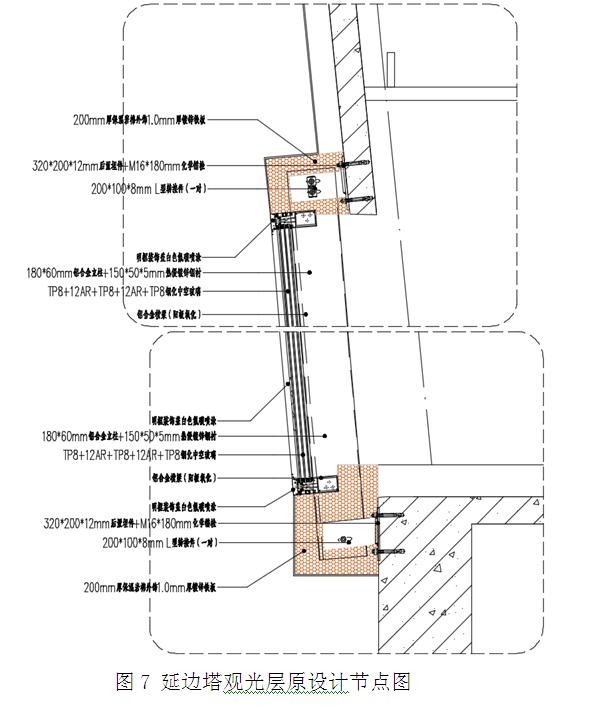 原建筑觀光層采用帶型窗,本次改造調(diào)整為構(gòu)件式玻璃幕墻,幕墻設(shè)計(jì)的觀光層玻璃幕墻基本節(jié)點(diǎn)見圖7。