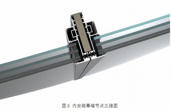 根據(jù)幕墻施工圖,施工人員必須到幕墻外側(cè)進(jìn)行安裝工作,這給項(xiàng)目施工帶來較大困難。通過和設(shè)計(jì)單位和甲方溝通,施工深化設(shè)計(jì)將此位置調(diào)整為內(nèi)裝式構(gòu)件幕墻,得到了設(shè)計(jì)單位和甲方的認(rèn)可。這種內(nèi)裝幕墻構(gòu)造,先安裝幕墻主龍骨,然后在室內(nèi)安裝幕墻玻璃,簡化了施工工藝,而且,為后續(xù)幕墻使用中出現(xiàn)的玻璃更換提供了便捷。調(diào)整后的幕墻施工圖在模型中放樣,擬合了安裝順序和構(gòu)造,確保其可以實(shí)施。三維示意圖見圖8。
