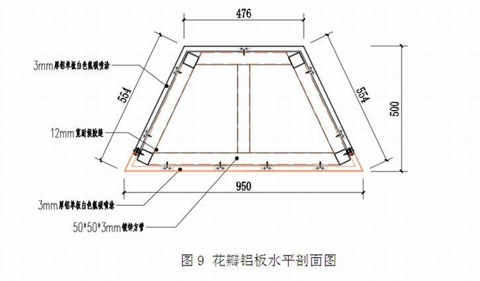 延邊塔的觀光層外側(cè)新增一個(gè)鋁板花瓣造型,鋁板造型固定在主體結(jié)構(gòu)上,和主體結(jié)構(gòu)的關(guān)系比較復(fù)雜。原設(shè)計(jì)圖給出了造型截面的基本做法,見圖9。由于花瓣鋁板造型復(fù)雜,且鋁板造型和主體結(jié)構(gòu)的距離較大,成型和空間定位的難度較大。