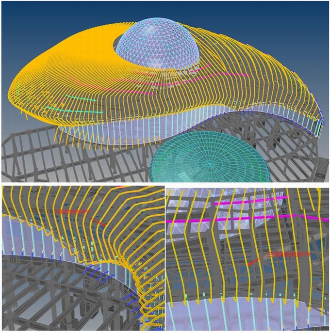本工程多功能廳陰陽魚曲面造型鋁板,因其獨(dú)特的外觀造型,造型無任何規(guī)律,鋁板的主龍骨設(shè)計(jì)加工和安裝存在極大的困難。經(jīng)過我們?cè)O(shè)計(jì)團(tuán)隊(duì)對(duì)整個(gè)造型進(jìn)行分析,最終決定將主龍骨采用三維扭曲拼接桿件的設(shè)計(jì)方法,三維扭曲拼接桿件的設(shè)計(jì)、加工、安裝是本項(xiàng)目的一大難點(diǎn)。我們依照這個(gè)思路進(jìn)行精細(xì)實(shí)體建模,建成深度LOD 400的施工模型,模型中的桿件可直接提取加工圖。