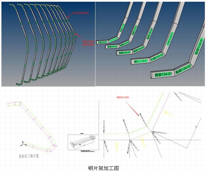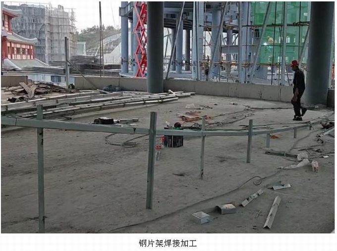 將加工完成的鋼片架吊裝也是一件比較困難的事情,鋼片架由多段鋼方管拼焊在一起,一榀鋼片架長度有10米左右,在起吊的過程中很容易發(fā)生彎曲變形,甚至是撕裂焊縫,吊裝還需要按模型坐標(biāo)精準(zhǔn)定位;為了解決吊裝的時(shí)候鋼架變形的問題,我們?cè)诘跹b前將鋼片架上加焊了斜撐,斜撐設(shè)置在最容易變形的部位,等吊裝完成后再拆除;鋼片架的定位方面我們采用了三點(diǎn)定位,分別是鋼片加的上端點(diǎn)、中間點(diǎn)、下端點(diǎn),將這三個(gè)點(diǎn)按模型中坐標(biāo)點(diǎn)進(jìn)行定位,定位完成后焊接鋼片架支撐鋼方管。