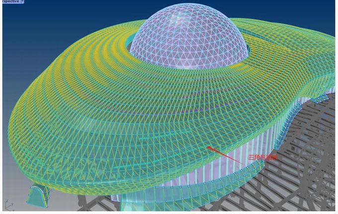 關(guān)鍵詞:高難度無規(guī)律復(fù)雜造型鋁板;三角形鋁板;球形玻璃采光頂;三維扭曲拼接桿件;局部連接件有限元仿真計(jì)算分析;40天極限工期;施工測(cè)量定位
