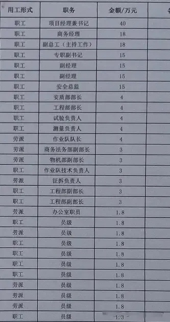 “項目經(jīng)理40萬、總工18萬、部長4萬、試驗員1.8萬……”