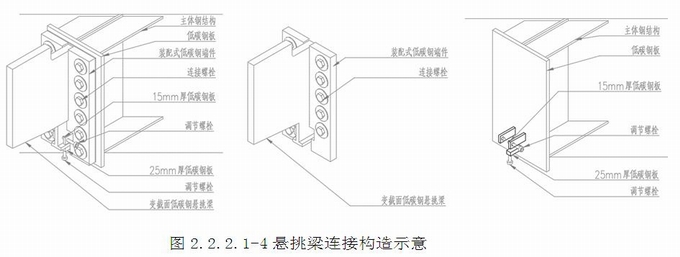 變截面低碳鋼懸挑梁構造:變截面低碳鋼(詞條“碳鋼”由行業大百科提供)懸挑梁與低碳鋼端件焊接成整體,2塊20mm厚低碳加勁鋼板和2塊15mm厚低碳加勁鋼板分別焊接在懸挑梁兩側,提高懸挑梁的穩定性,以上組成懸挑梁的整體,稱為變截面懸挑結構,懸挑結構通過螺栓固定在主體結構支撐上。(圖2.2.2.1-3~4)