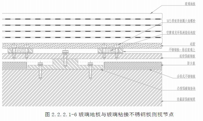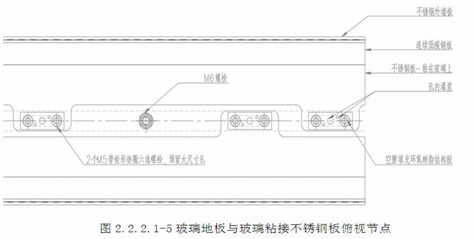 玻璃地板構造:8mm不銹鋼板作為副框安裝在玻璃地板上,整體俯視為凹凸造型,副框地板玻璃拼裝時,兩片玻璃的凹凸塊相互契合,各自形成連接塊。凸塊上設有一個長條孔,在凸塊表面設置2mm厚鋼墊片(詞條“墊片”由行業大百科提供),鋼墊片上設有一個大圓孔和兩個小圓孔,2個M5的螺栓通過鋼墊片與凸塊連接,長條孔的設置,使得地板可在平面內進行安裝定位調節,調節完畢后,通過大圓孔往凸塊的長條孔內灌環氧樹脂膠,進行固定,大圓孔為灌漿孔,兩個小圓孔為排氣孔,保證環氧樹脂膠充滿長條孔。灌漿設計使得結構牢固,安裝簡便,全過程無焊接作業。(圖2.2.2.1-5~7)