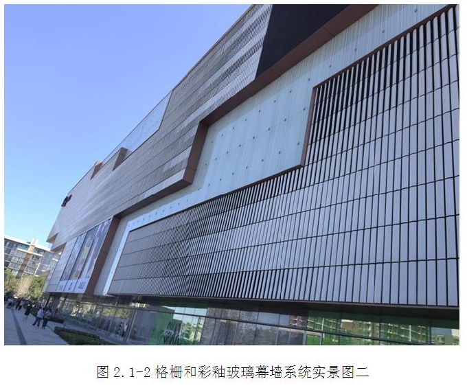 建筑整體外觀設計與周圍環境相融合,建筑幕墻外立面前后錯動,通過巧妙的結構和色彩對比形成凹凸有致的律動感。彩釉玻璃采用了大面板設計,部分玻璃高度達到了6000mm,不僅具有通透性,還使建筑具有色彩和科幻現代感,增加了視覺上的美觀性和裝飾性;建筑二層以上立面采用裝飾格柵系統和彩釉玻璃幕墻系統交錯布置,鋁合金格柵設計具有多個自由角度、挺拔向上、整齊一致的效果,是幕墻設計及施工重難點部位。(圖2.1-1~圖2.1-2)