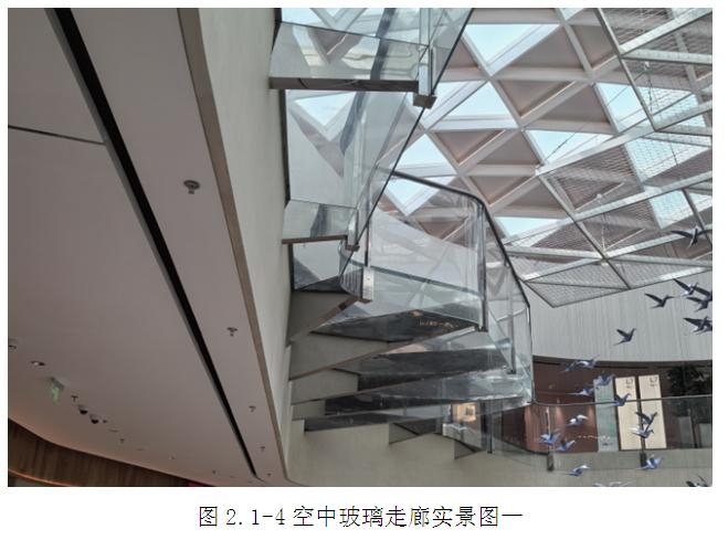 建筑室內打造了如同云端漫步的Skywalk空中玻璃走廊,走廊位于項目的頂層,橫跨整個商業綜合體,連接了不同的購物區域和休閑空間。走廊構造上采用全玻璃設計,不僅提供了極佳的視野,同時也增強了項目的現代感和科技感。走廊與向陽生長的藍色飛鳥、充滿異域情調的懸浮菠蘿以及通透晶瑩的采光頂天窗相互融合,為消費者提供了一個獨特的休閑空間。玻璃走廊采用高強度玻璃和鋼結構構造,確保了其堅固性和安全性。面板均為異形的超大玻璃,尺寸達2000x4500mm,且每塊尺寸都不一樣,同時支撐玻璃地板的變截面鋼梁懸挑最大尺寸達到4.5米,是設計及施工的重難點部位。(圖2.1-4~圖2.1-5)
