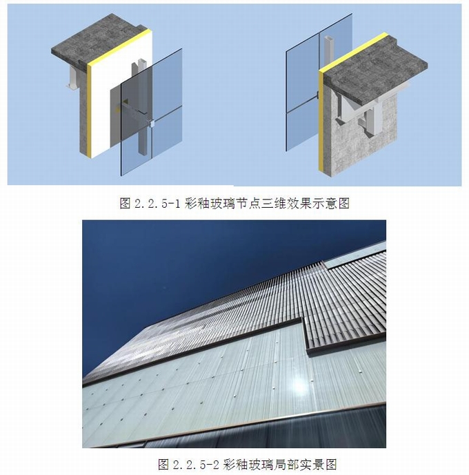 不銹鋼駁接件彩釉玻璃幕墻系統位于二層到檐口位置東、西立面,面板由15mm鋼化彩釉玻璃構成,采用豎向大板塊,玻璃分格高度達6000mm,玻璃中部采用不銹鋼夾具六點支撐形式,頂底入槽固定,主龍骨(詞條“主龍骨”由行業大百科提供)立柱采用鋼方管,表面氟碳涂裝。六層局部位置為中空玻璃區域,采用12Low-E+12Ar+12mm超白鋼化中空彩釉玻璃,立柱龍骨為鋼鋁結合,面板為條紋彩釉圖案,通過彩釉圖案,給建筑增添色彩和現代感。(圖2.2.5-1~3)