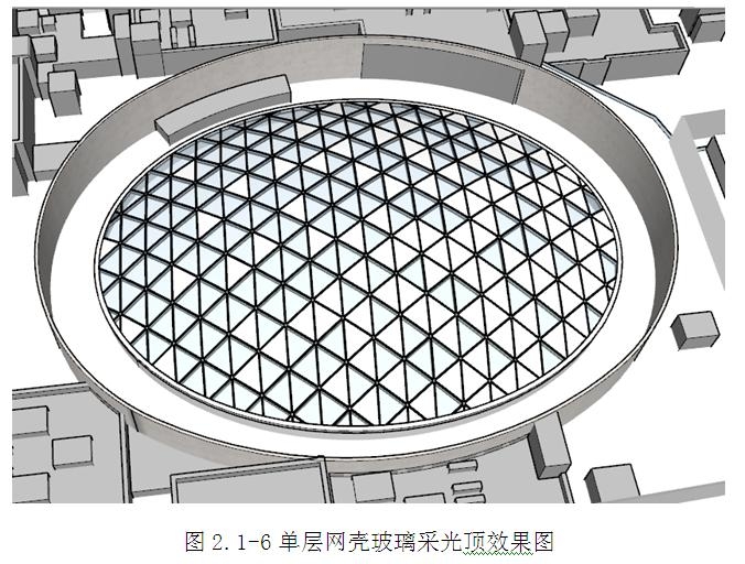 單層網殼采光頂為空間雙曲面造型,采用雙面鋁單板與玻璃間隔布置的形式,鋼結構桿件為150x70x250x10mm厚熱軋梯形鋼龍骨;12mm厚鋼板焊接中心件,中心件采用鑄鋼件,四周采用150x70x250x10mm厚熱軋梯形鋼龍骨,鋼件與鋼件及龍骨之間采用坡口等強連接。支座(詞條“支座”由行業大百科提供)鋼件與鋁合金底座連接,可調節鋁合金底座的高低,定位后通過螺釘擰緊固定;支撐輔助型材通過鋁合金壓塊固定在底座上,支撐輔助型材與鋁合金邊框連接一端設置有球頭構造,鋁合金邊框設置有凹槽構造,球頭嵌入凹槽里面,可調節采光頂面板的角度。(2.2.3.1-3~5)