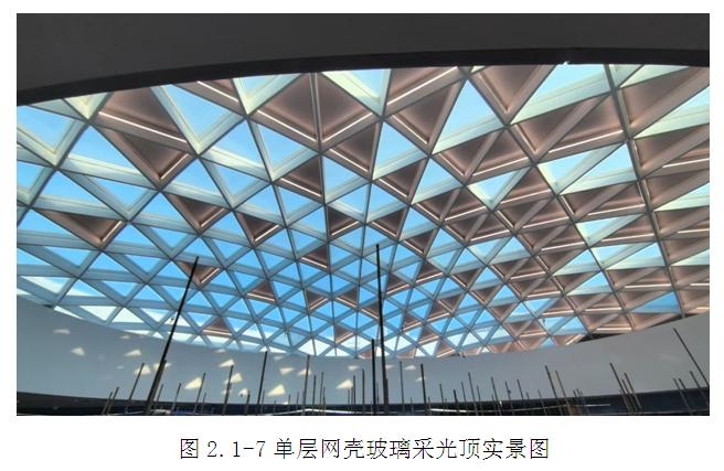 本項目屋頂有三個玻璃采光頂,1個為鋼結構單層網殼玻璃采光頂,2個平面鋼結構玻璃采光頂。單層網殼玻璃采光頂采用三角形面板擬合曲面造型,平面玻璃采光頂主要采用矩形平板面板,采光頂的設計使得室內的環境通透、明亮,形成一種藍天、白云的裝飾效果,與周圍曲面造型鋁板、UHPC板和格柵線條系統及自然環境相互融合、相互襯托,突顯整個建筑的自然氣息,同時又不失現代科幻的建筑效果。其中單層網殼玻璃采光頂為空間雙曲面網殼結構,構件及節點(詞條“節點”由行業大百科提供)數量多,形式復雜,采光頂最大跨度約為33.4米,是設計及施工的重難點部位。(圖2.1-6~圖2.1-8)